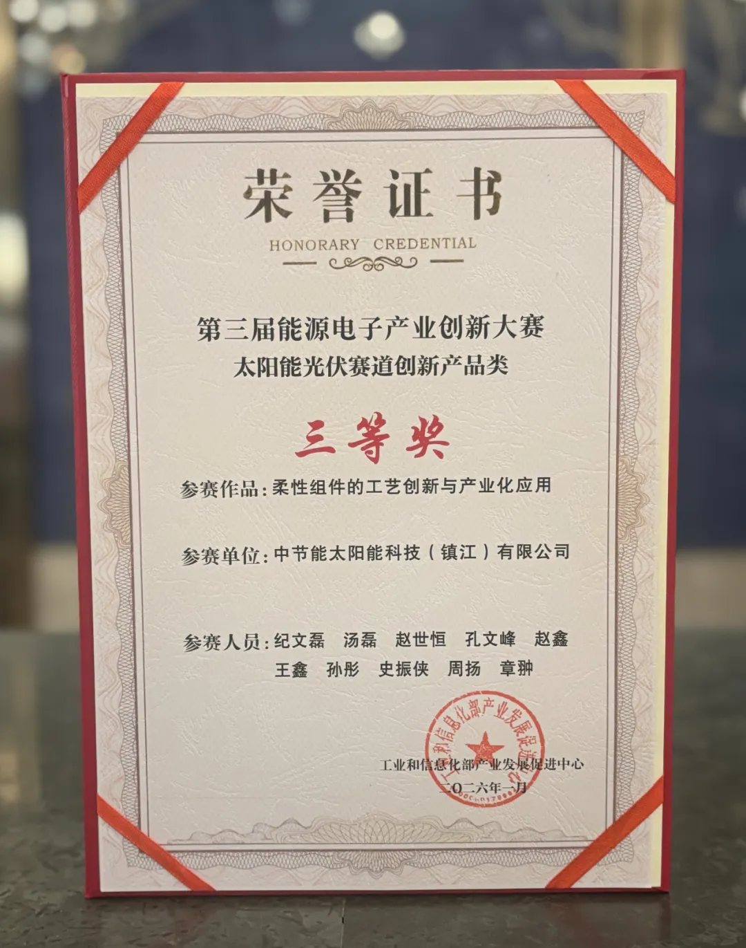在“光能杯”颁奖盛典上,镇江公司获评为“最具影响力光伏组件企业”。在能源电子产业创新大赛中,公司申报的“智慧能源一体化解决方案助力企业绿色发展”项目荣获创新应用类二等奖,“柔性组件的工艺创新与产业化运营”项目获得创新产品类三等奖。系列获奖彰显了镇江公司在技术研发、产品创新与市场应用方面的综合能力。