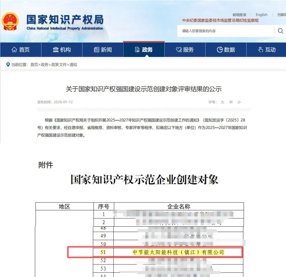 近日,国家知识产权局正式公示2025-2027年国家知识产权强国建设示范创建对象名单,镇江公司凭借在知识产权创造、运用、保护、管理全链条的综合实力成功入选,进入为期三年的高标准培育阶段。这既是对企业十余年深耕光伏产业、坚持科技立企与知识产权战略深度融合的充分肯定,也标志着其在引领光伏行业高质量发展、迈向知识产权强企的道路上迈出重要一步。
