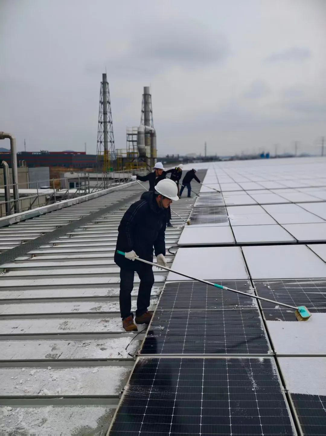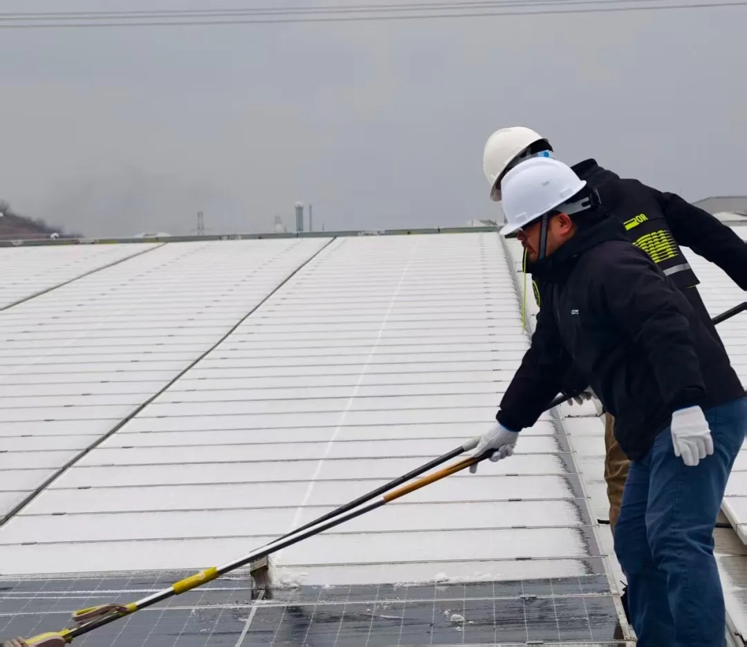 时值岁末年初,一轮强寒潮伴随雨雪席卷多地,分布式光伏电站迎来严峻的冬季运行考验。在此背景下,镇江公司一支由电池中心、组件中心技术骨干组成的跨部门联合运维团队,毅然顶风冒雪,深入电站一线,以专业能力与高效协同,全面打响了一场保障设备安全、提升发电效能的冬季攻坚战。面对低温雨雪导致电站出力周期性下降的实际情况,团队主动打破职能边界,精准整合优势技术力量,充分利用发电负荷较低的运行“窗口期”,全面展开预防性维护与系统隐患排查,为2026年度发电目标的达成夯实设备与管理基础。 破冰除雪,守护发电“生命线” 降雪过后,光伏组件易被冰雪覆盖,严重影响发电效率并带来潜在安全风险。运维人员身着全套防寒装备,使用专业工具,对阵列进行逐排精细化清雪除冰。寒风凛冽,作业艰辛,他们坚守的身影与冰封的光伏板共同构成了冬日里一道坚韧的风景线。