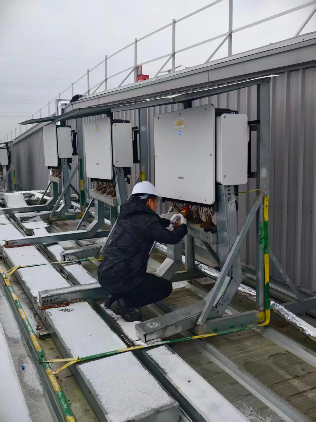 精心维检,保障系统“心脏”稳动 逆变器是电站的核心设备。运维人员对其开展精细维护,包括内部除尘、接线检查、并加装保温防潮材料等,有效防范低温凝露与积灰可能引发的故障,确保这一系统“心脏”在严寒中持续稳定跳动。跨部门协作模式在此过程中充分展现了技术互补、效率提升的优势。